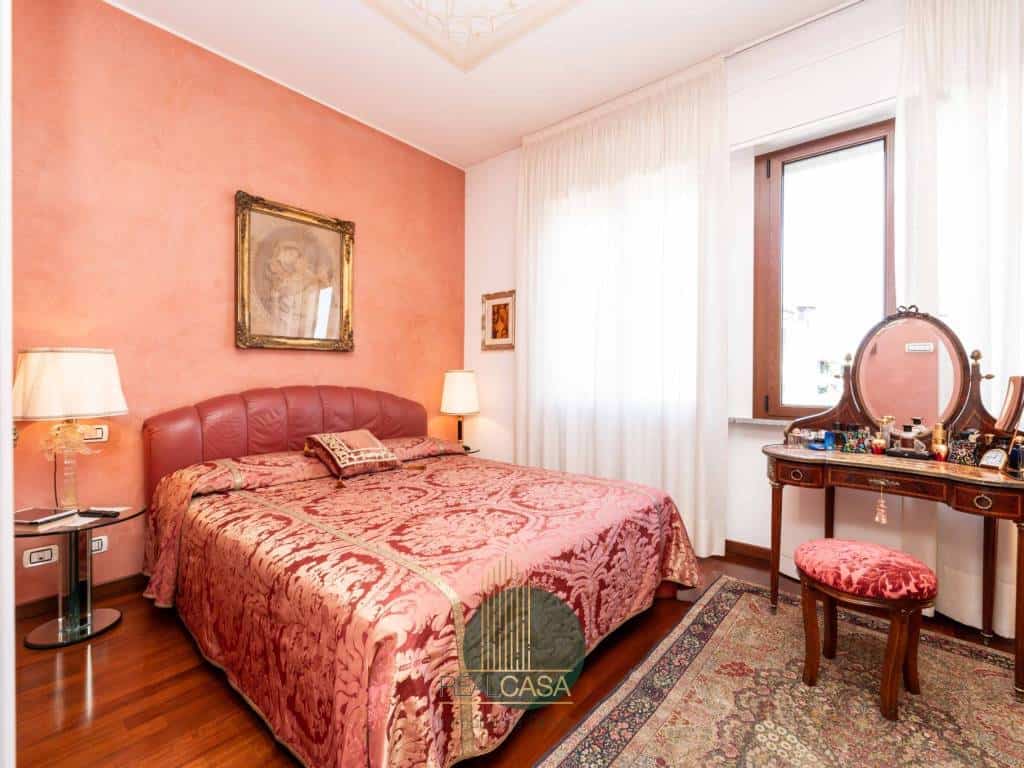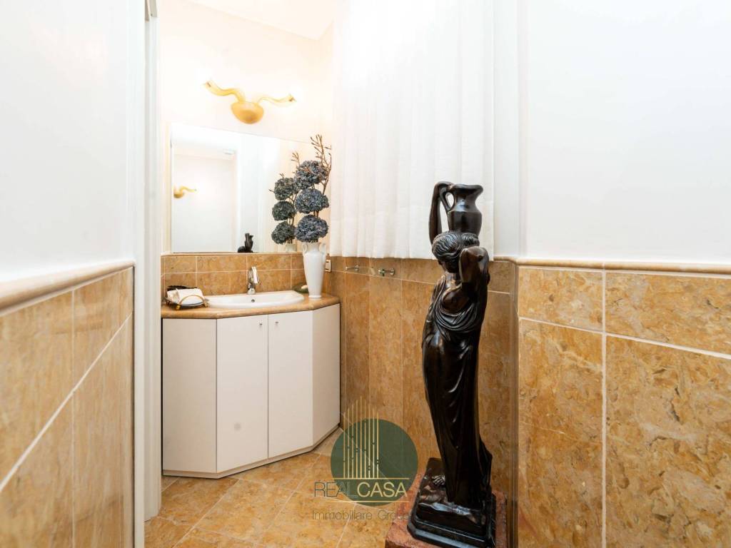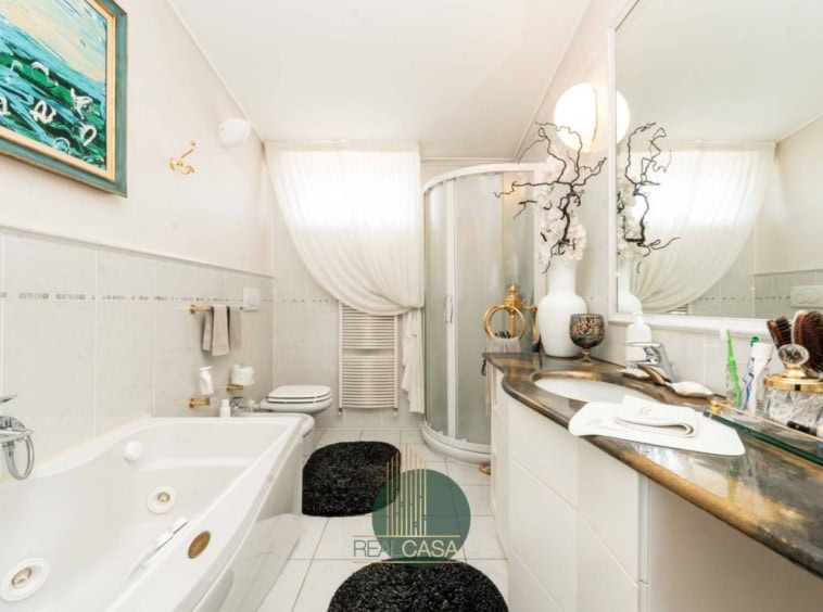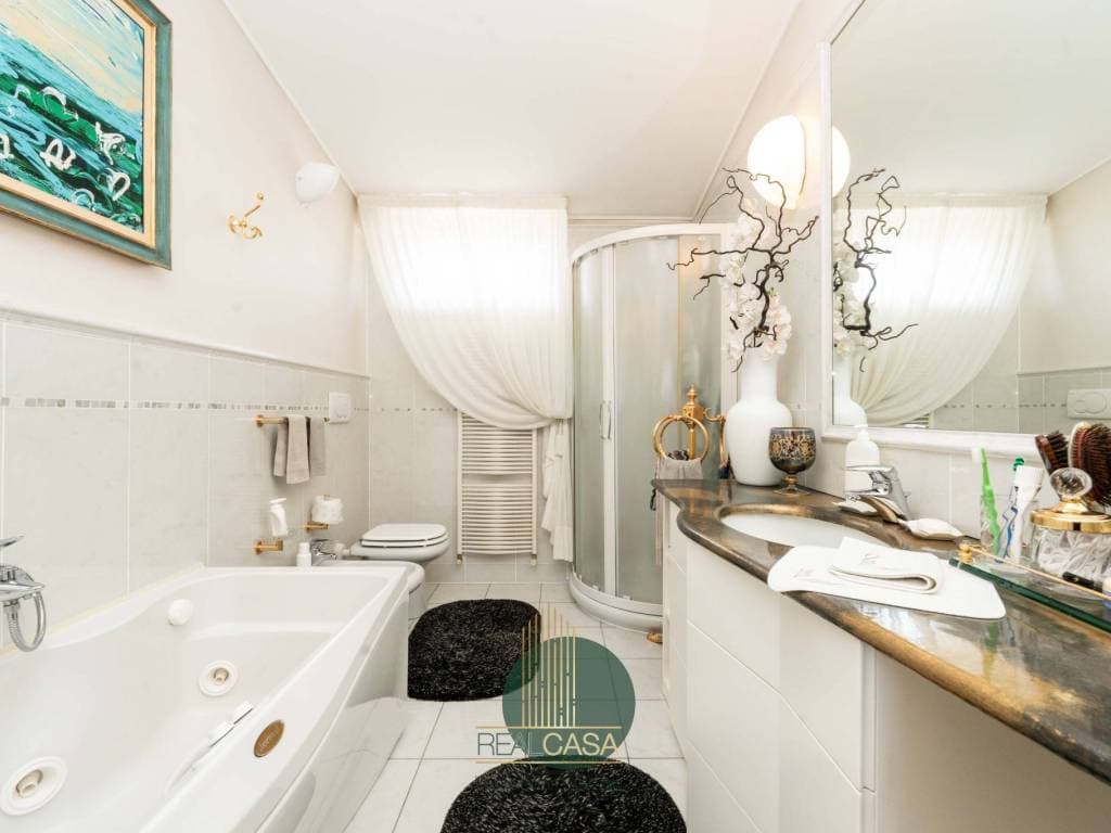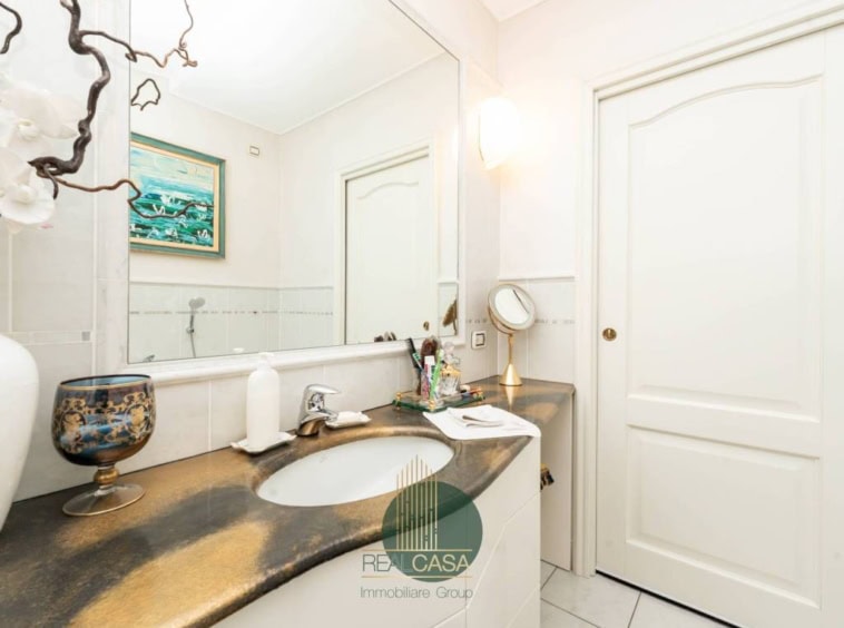 La zona notte comprende due camere matrimoniali e doppi servizi entrambi finestrati: il bagno padronale è dotato di vasca Jacuzzi e box doccia, mentre il secondo è interamente rivestito in marmo, con sanitari e box doccia di alta gamma.