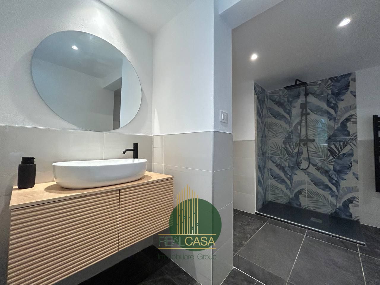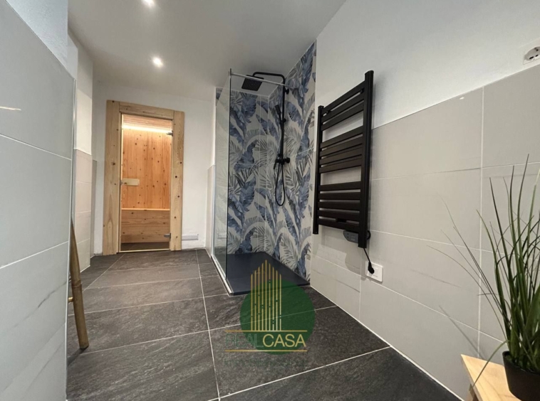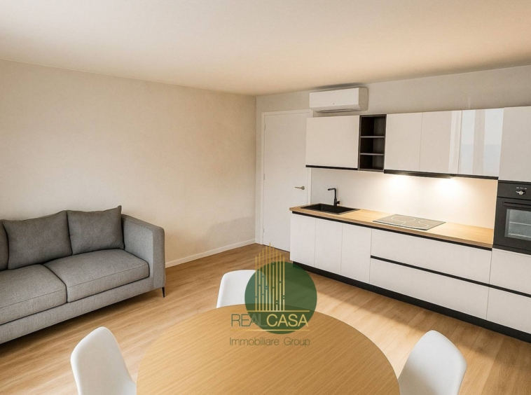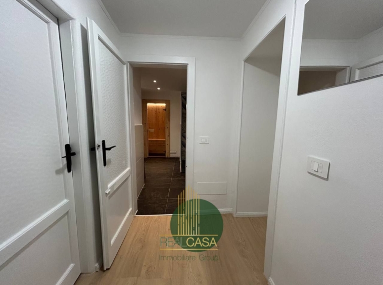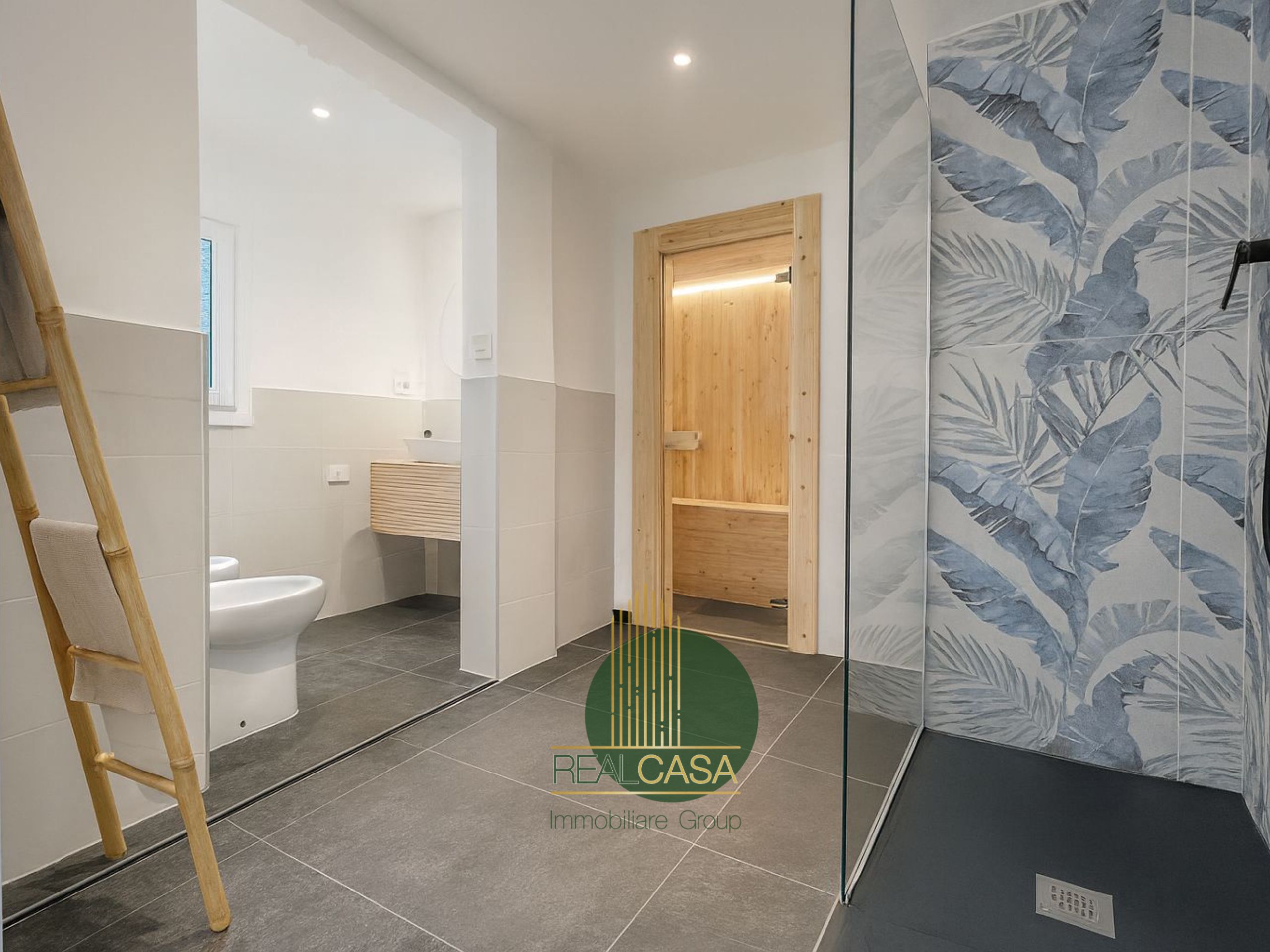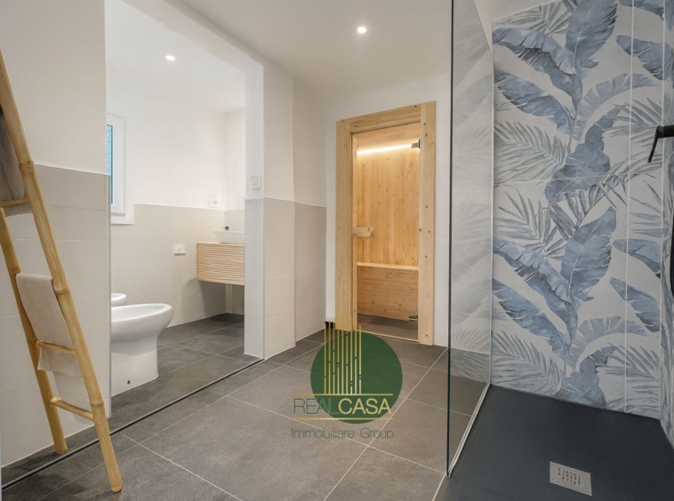 Completano la soluzione una pavimentazione effetto legno e rivestimenti in gres porcellanato, condizionatore INVERTER caldo/freddo, serramenti in PVC doppio vetro e portoncino blindato.
