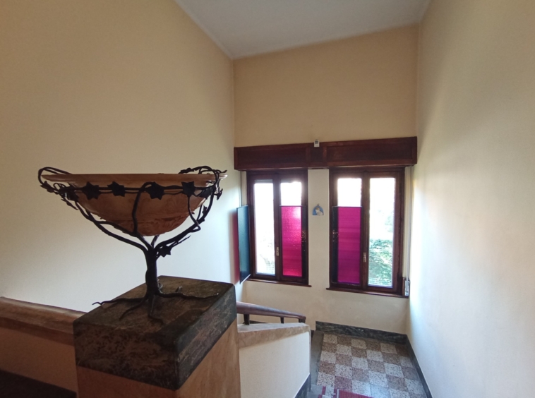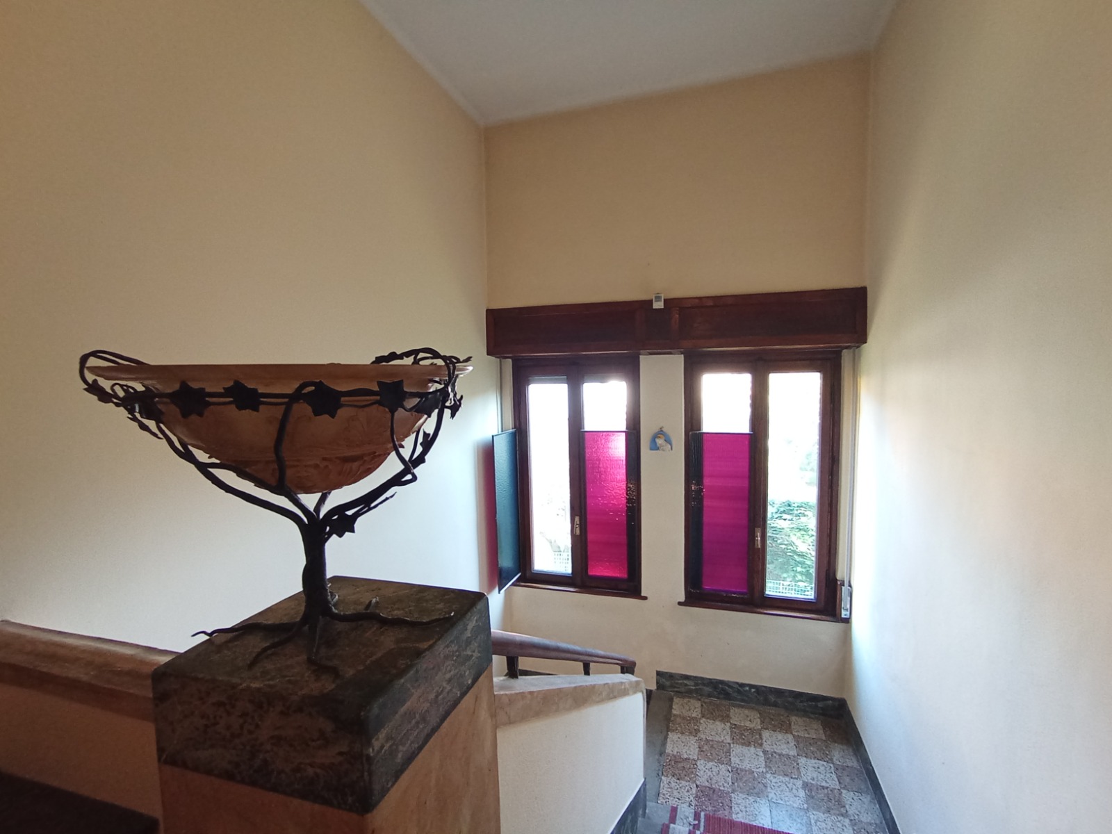 L’ampio ingresso ci accoglie e ci indirizza alle varie stanze: sala giorno di ampia metratura con caminetto, cucina, studio e seconda saletta e piccolo bagno di servizio; un ampia scala di pietra ci conduce al piano primo con quattro ampie e luminose camere, una di esse dotata di studio, a completare la zona notte balconi e terrazzi.